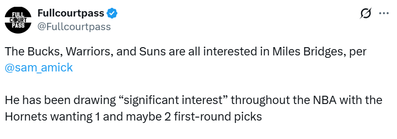 北京时间1月23日,随着交易截止日日益临近,黄蜂队前锋迈尔斯-布里奇斯已引发多支球队的强烈交易兴趣。据名记萨姆-阿米克报道,勇士、雄鹿和太阳均在追逐这位27岁球员的球队之列。