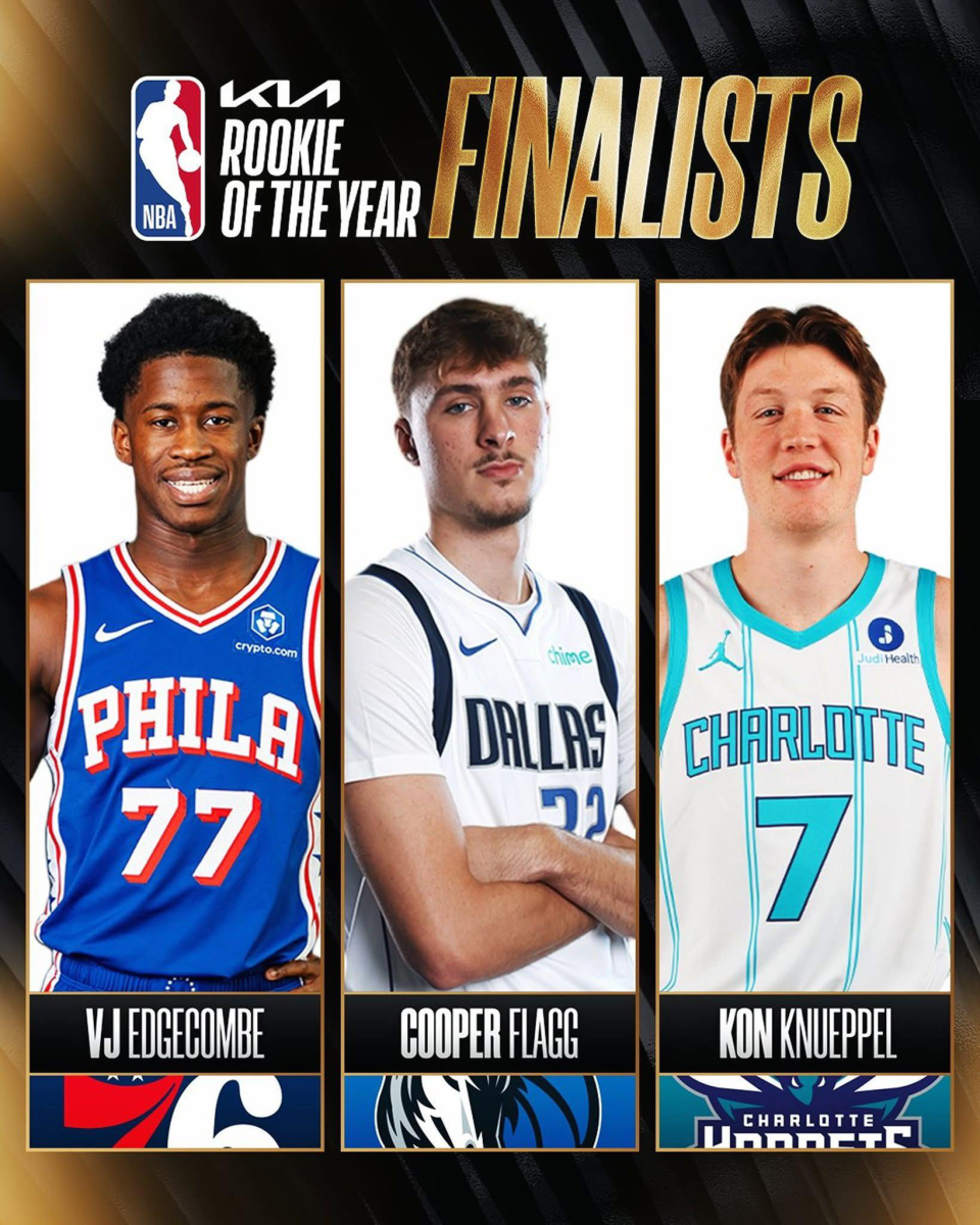 由100名成员组成的全球媒体评审团,投票选出了2025-26赛季起亚NBA年度最佳新秀。弗拉格得到56张第一选票,总分412分,克努佩尔得到44张第一选票,总分386分。本届前两名之间的得分差距为26分,是自2002-03赛季现行投票规则启用以来的历史第二小分差,仅次于2021-22赛季的15分差距(巴恩斯击败莫布利)。